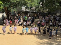 出席しらべ、今日やることなど先生のお話を聞きます。