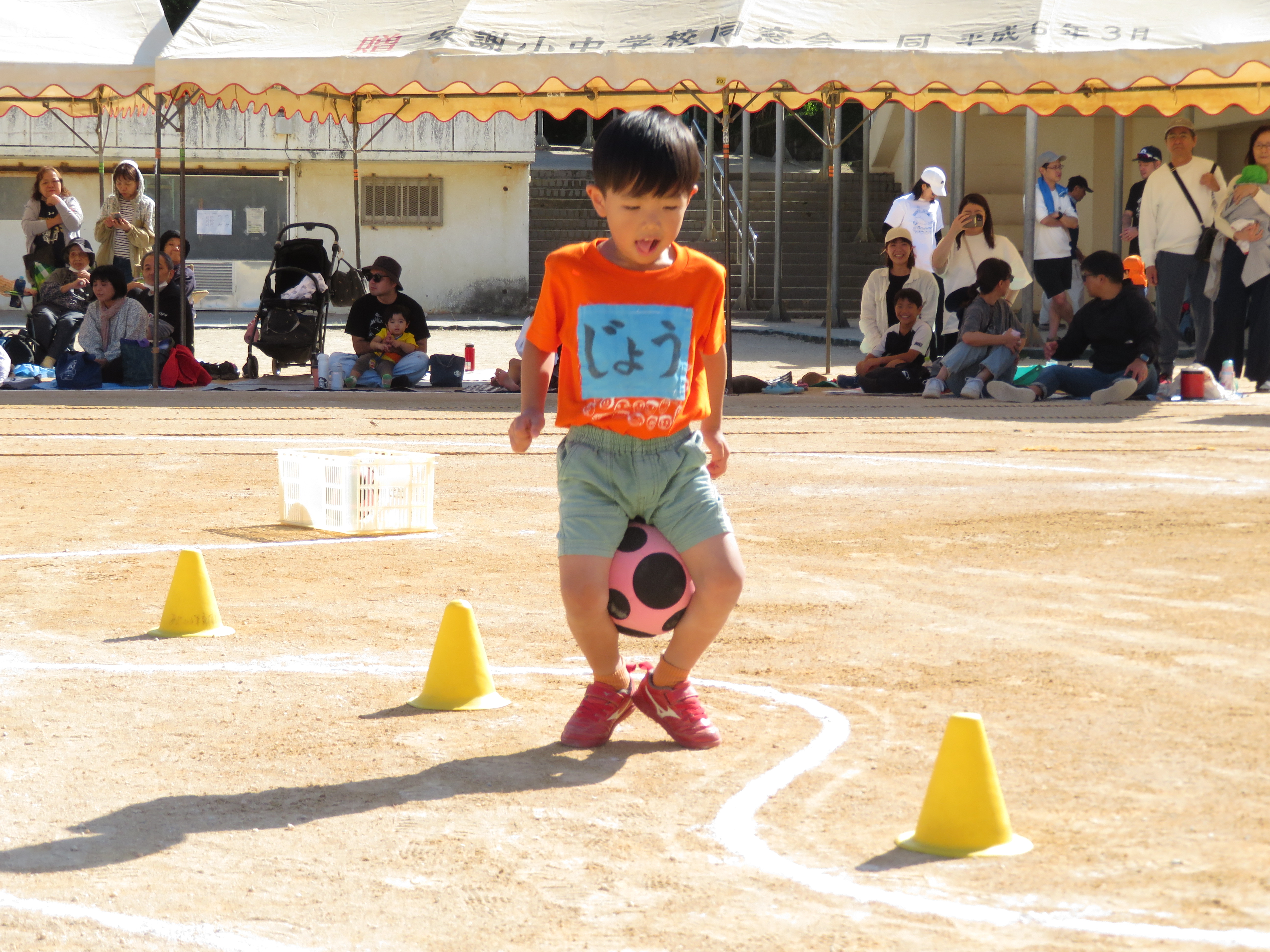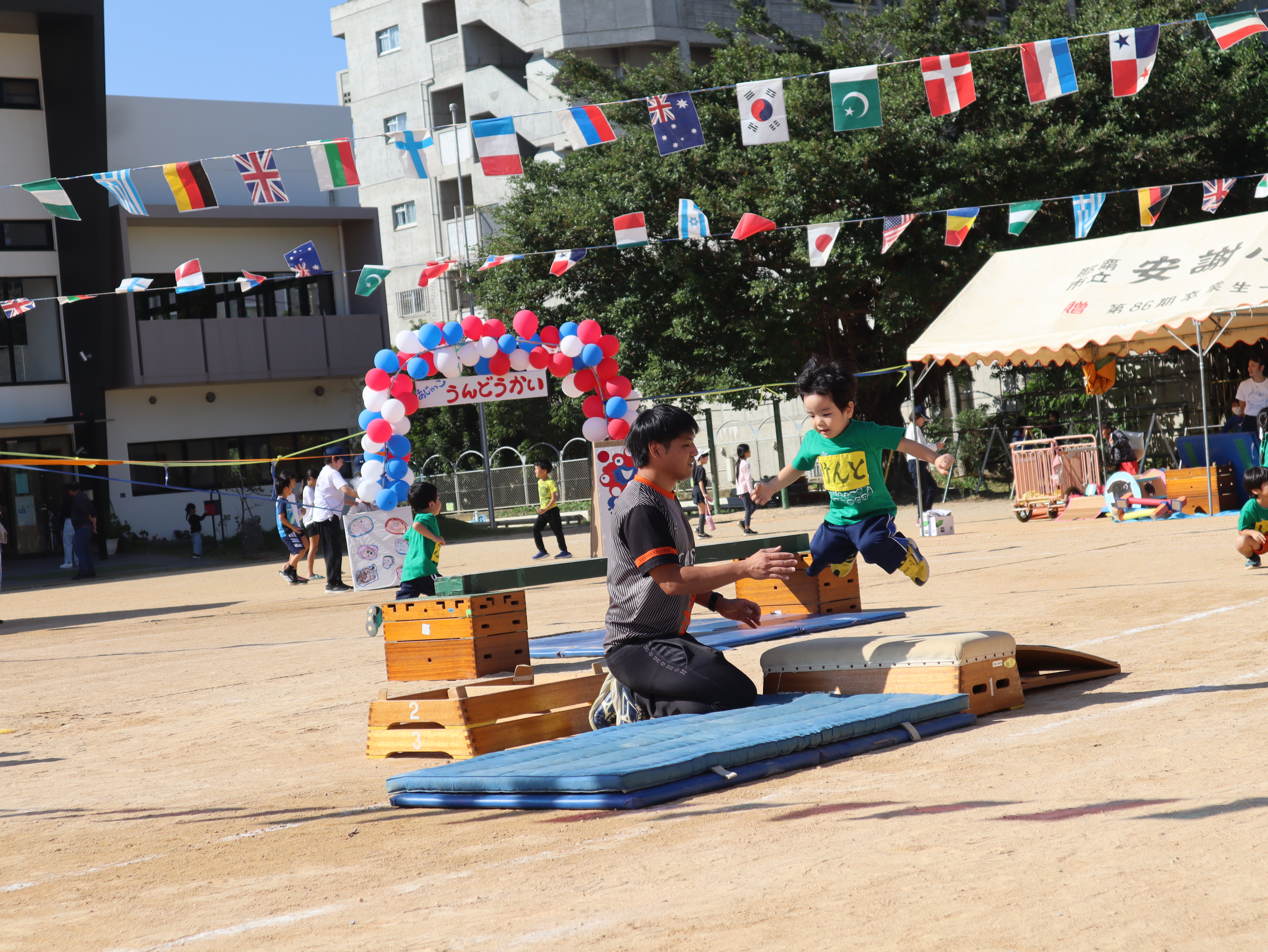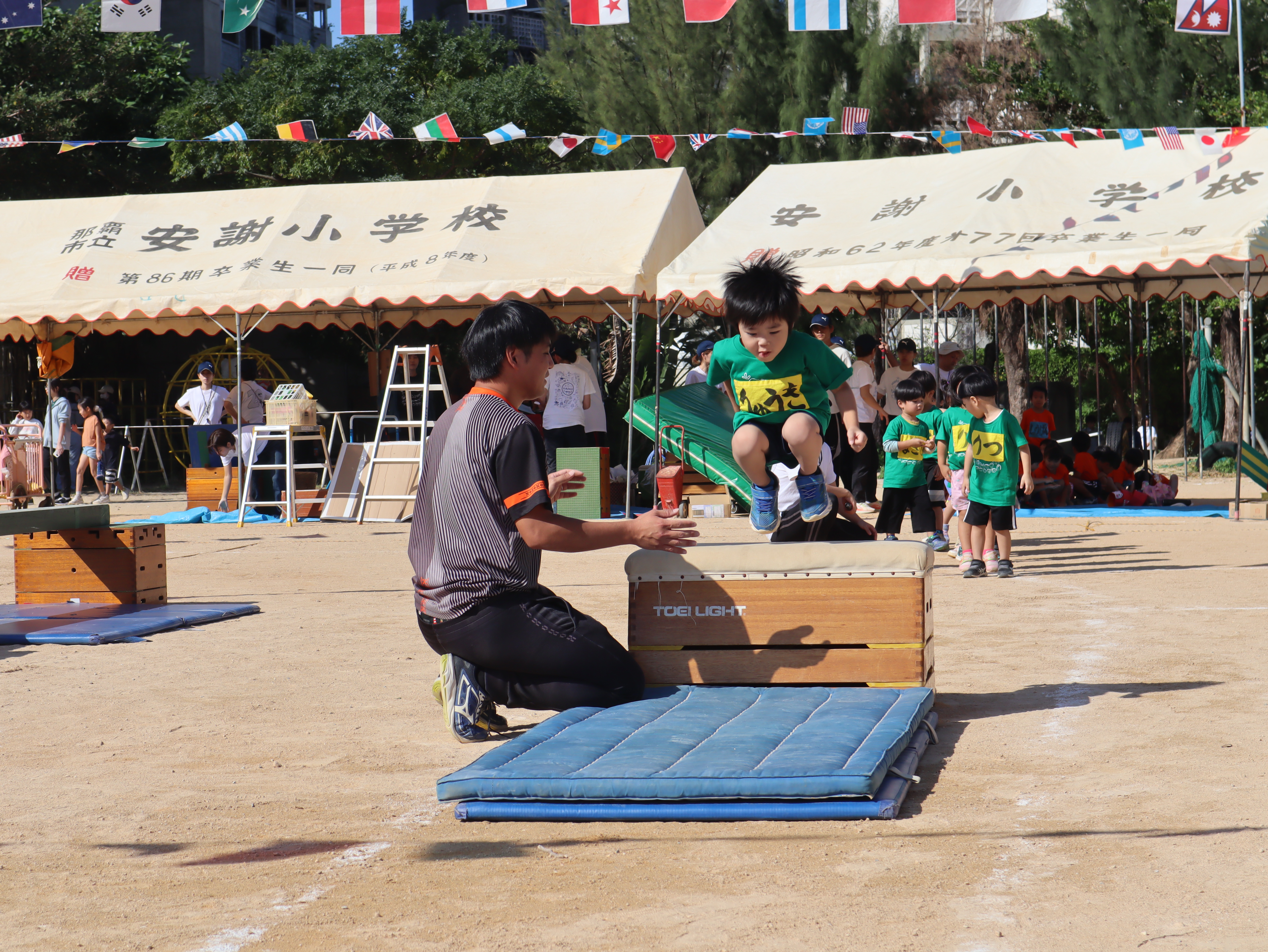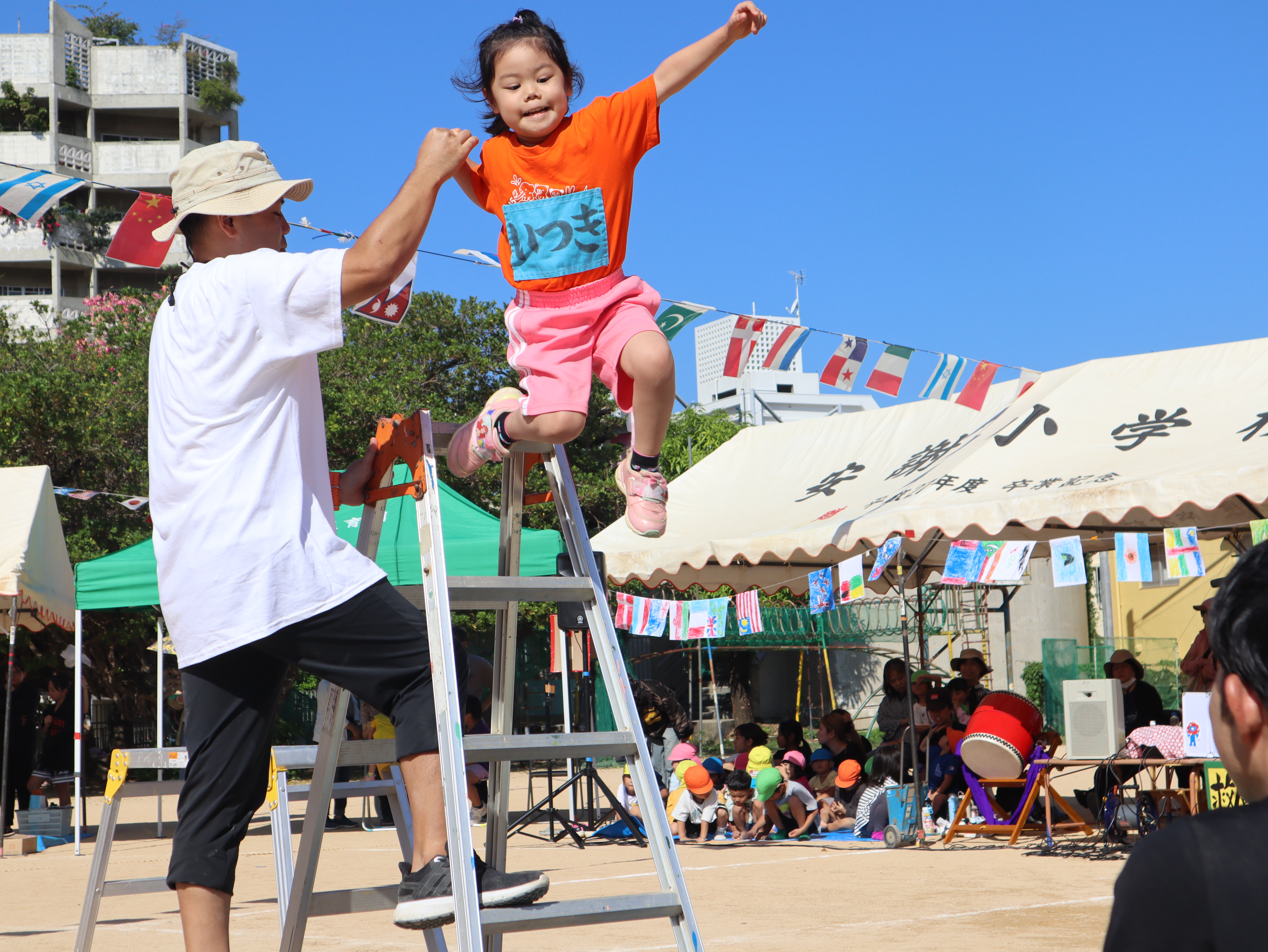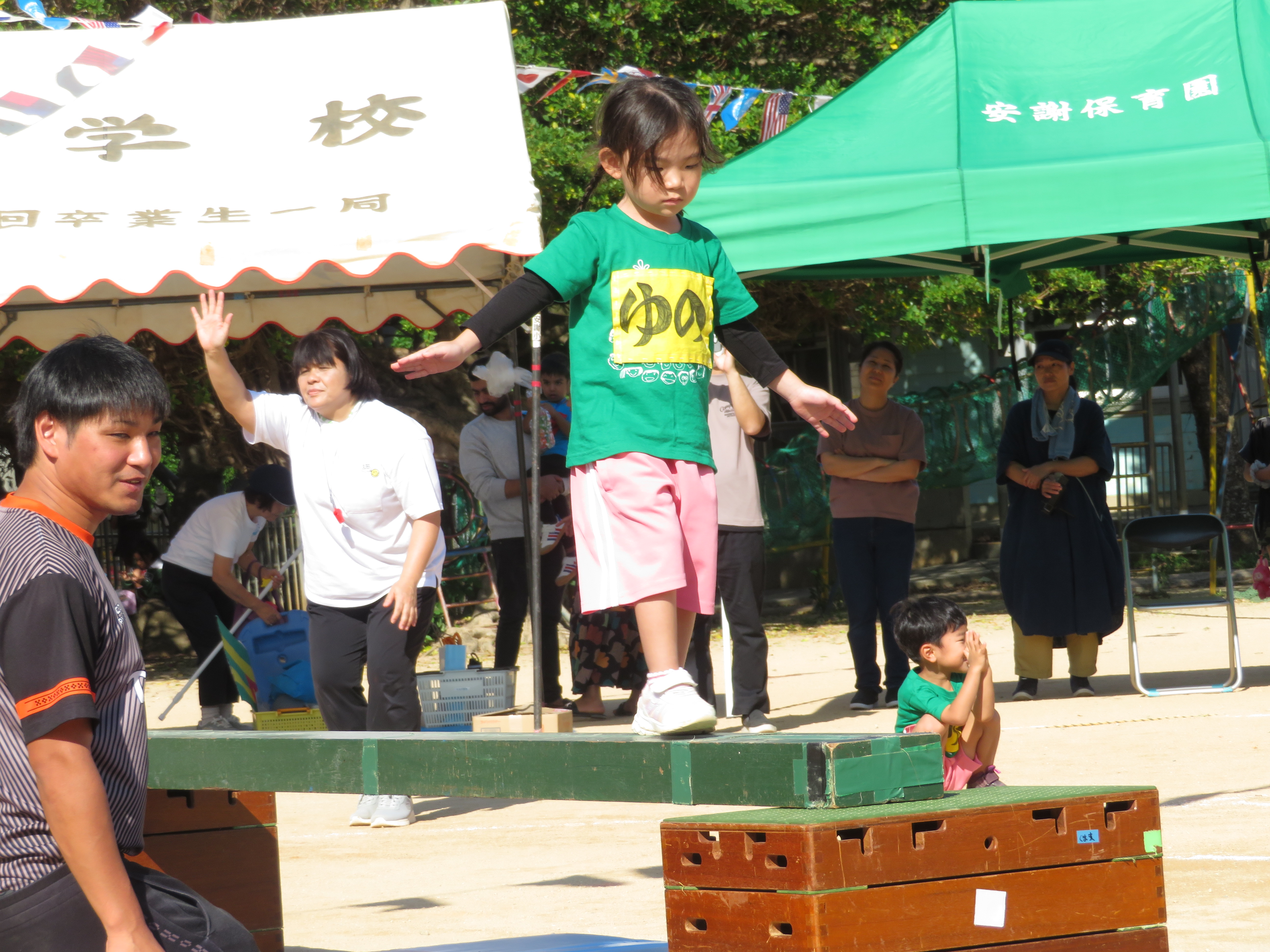 脚立からのジャンプ、鉄棒、ボール運び、キャタピラーとどれも少しドキドキする競技ですが、