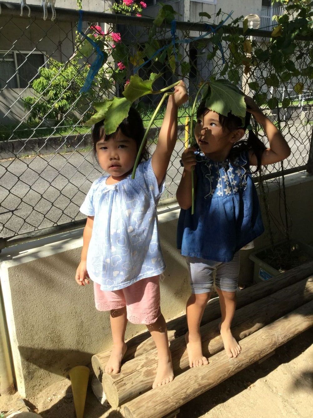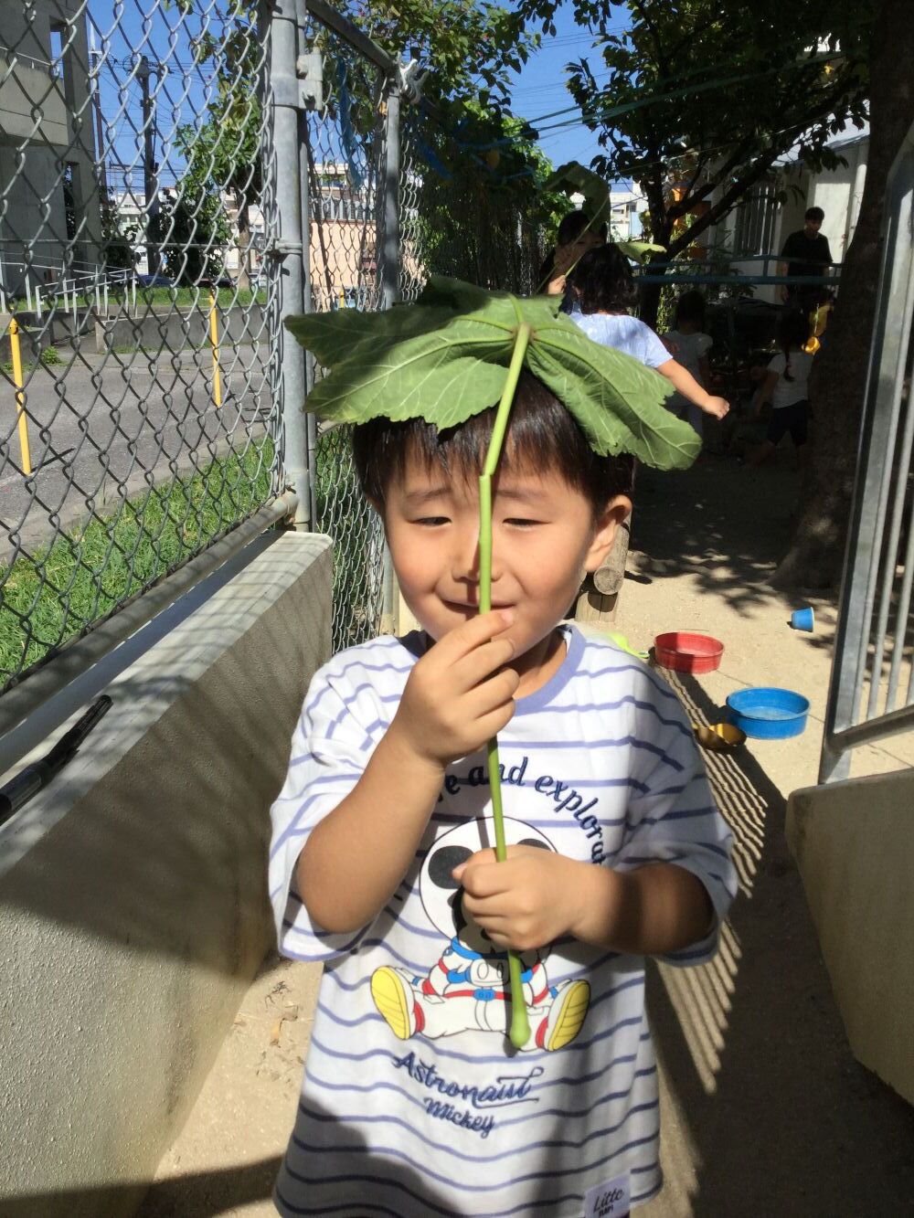 園庭のそばにある大きな葉っぱを傘にしてみたよ☆