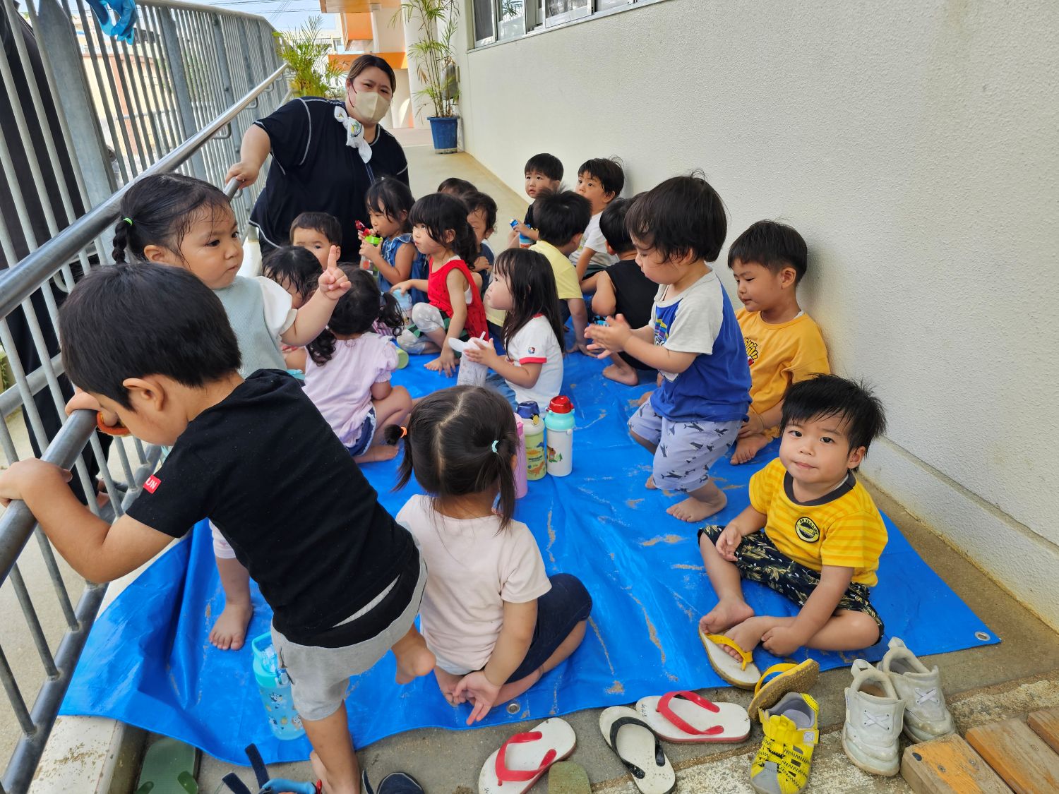 園庭横のスロープでブルーシートを敷いて