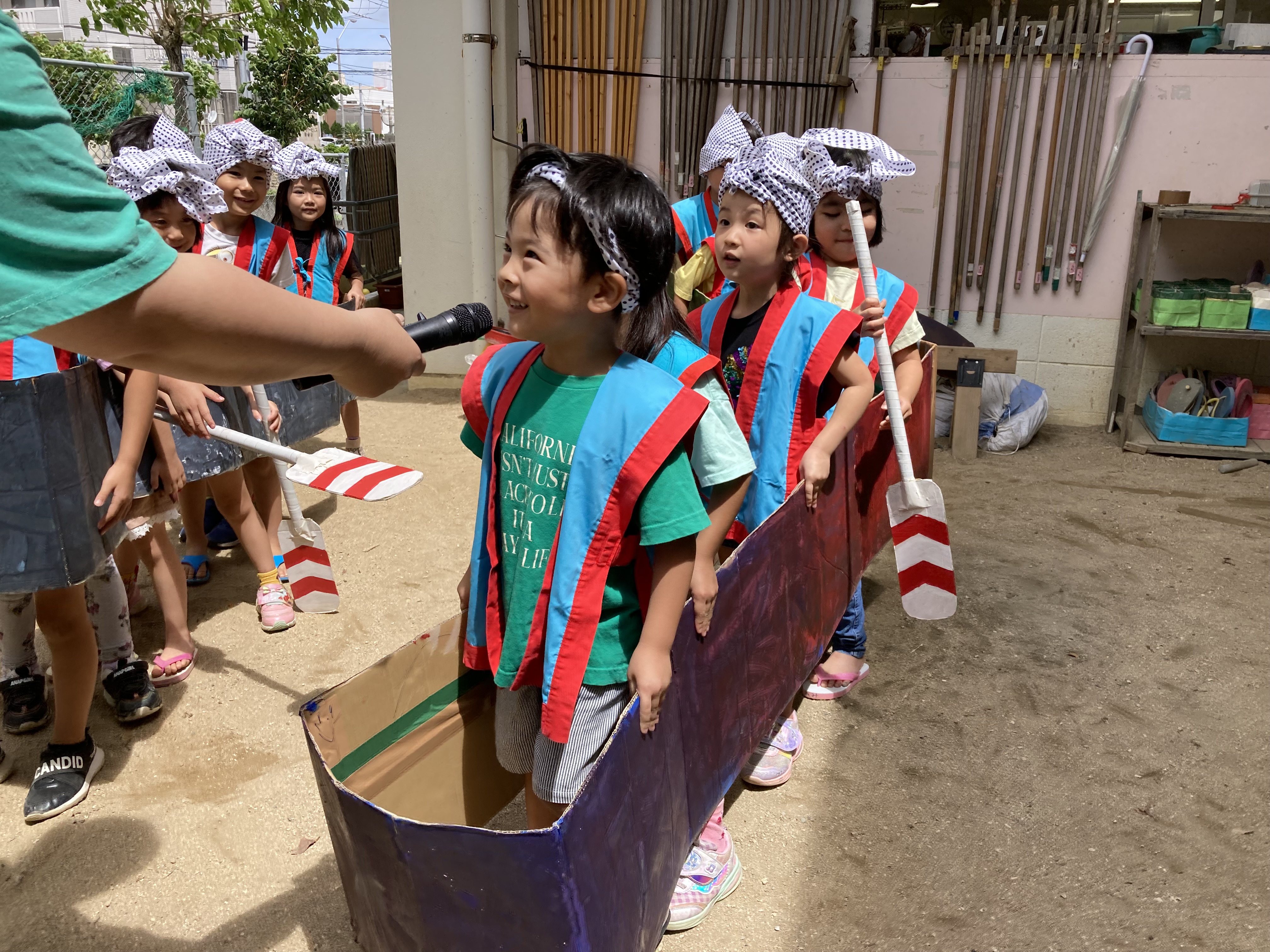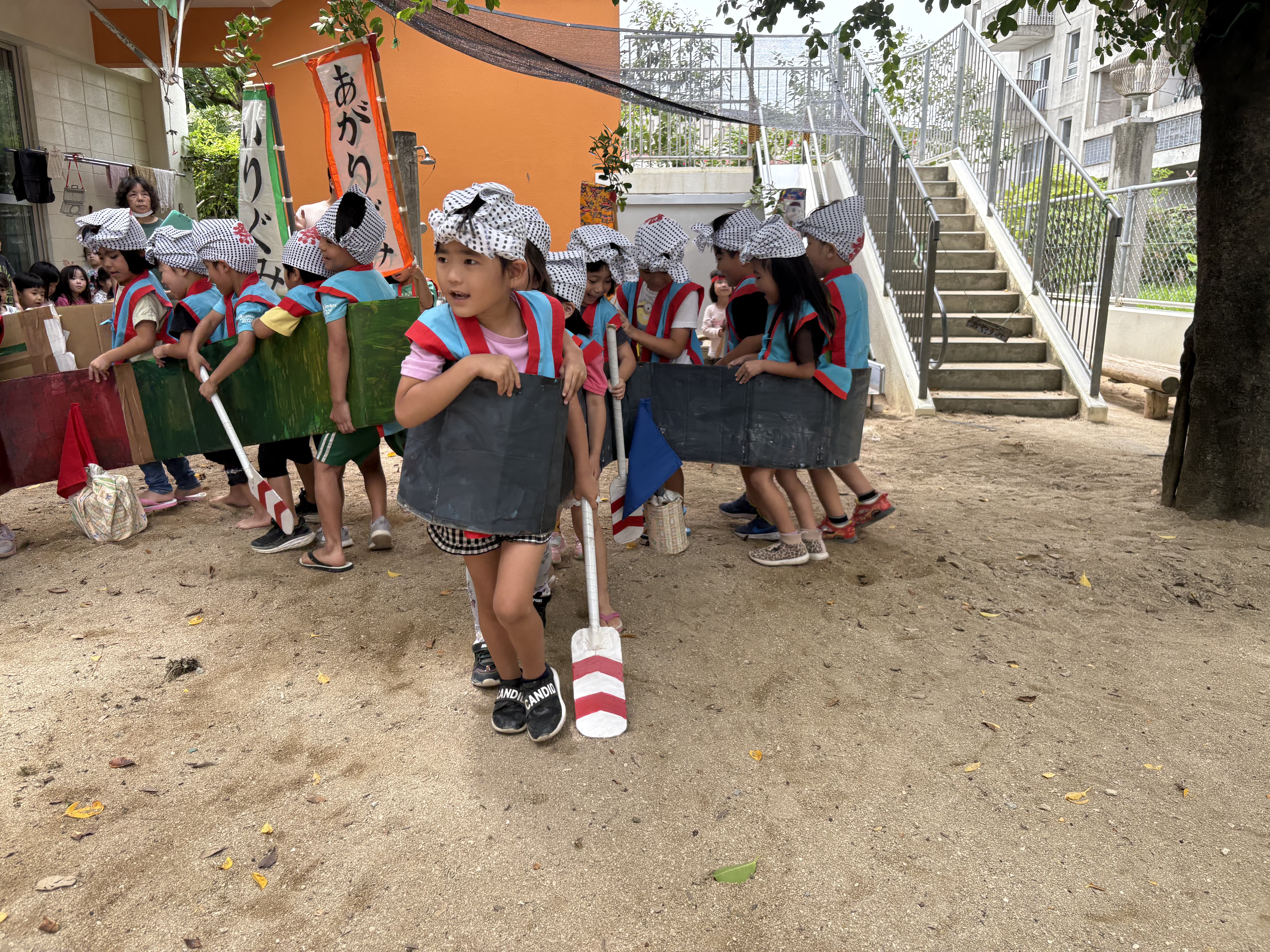 色を塗った段ボールをハーリー船に見立てて