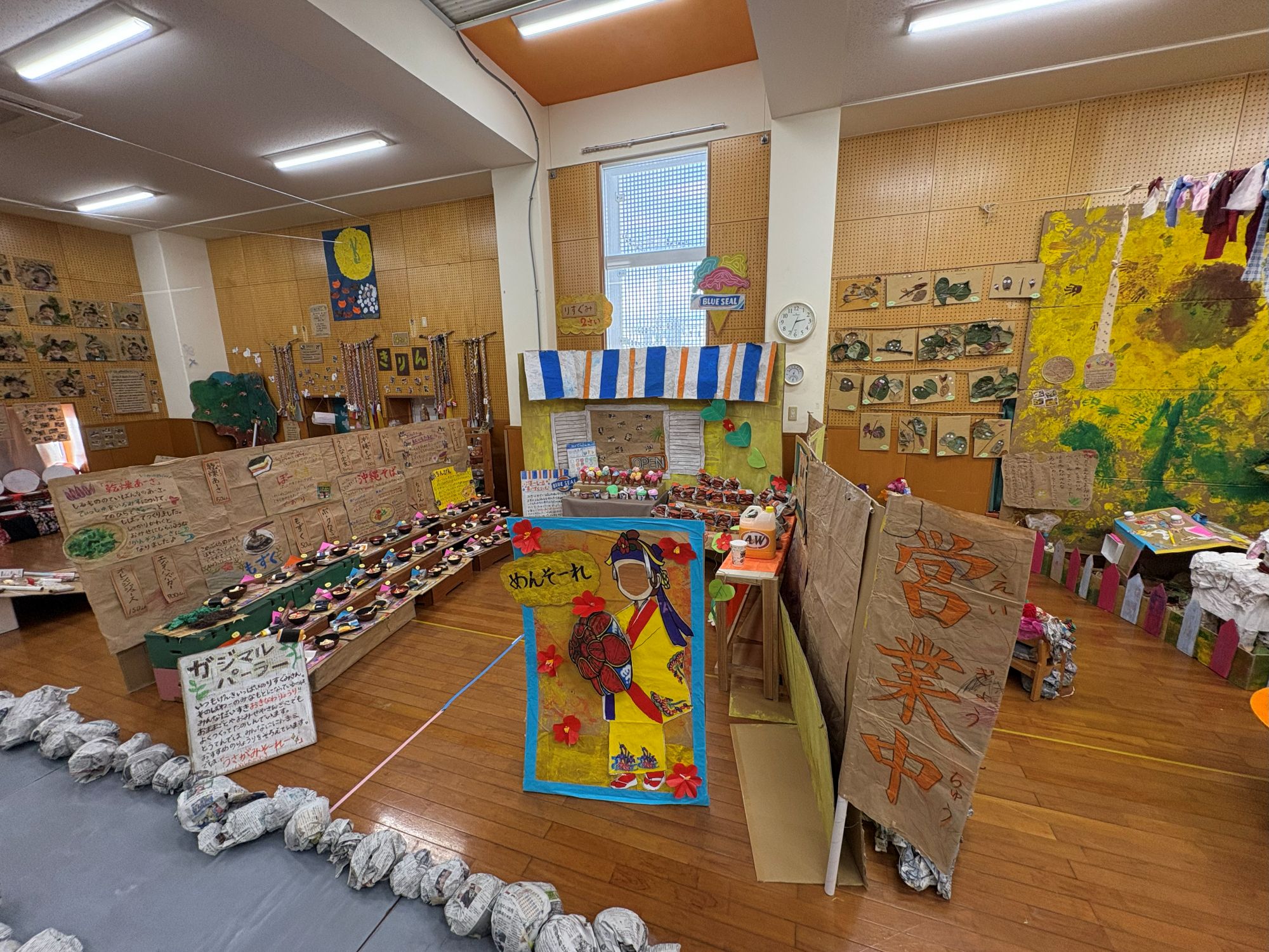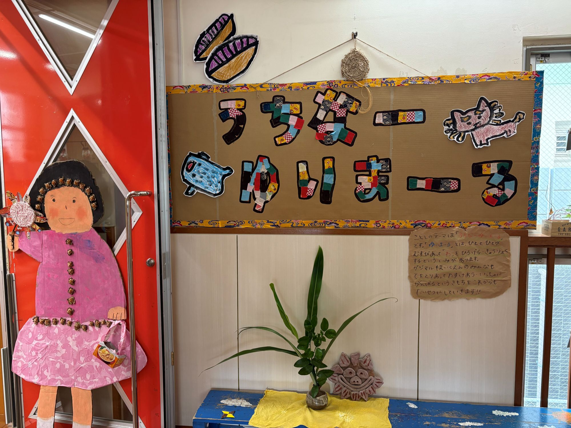 今年のテーマ【うちなーゆいまーる】の看板とぞうぐみ(5歳児)さんが作った女の子でお出迎え~