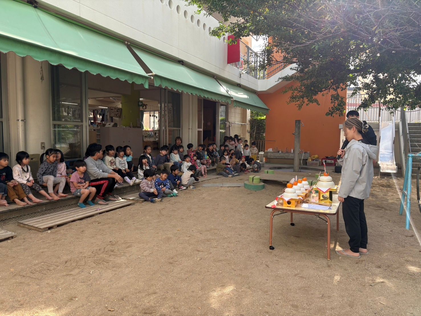 ムーチーの由来を手作りの大型紙芝居で見たり