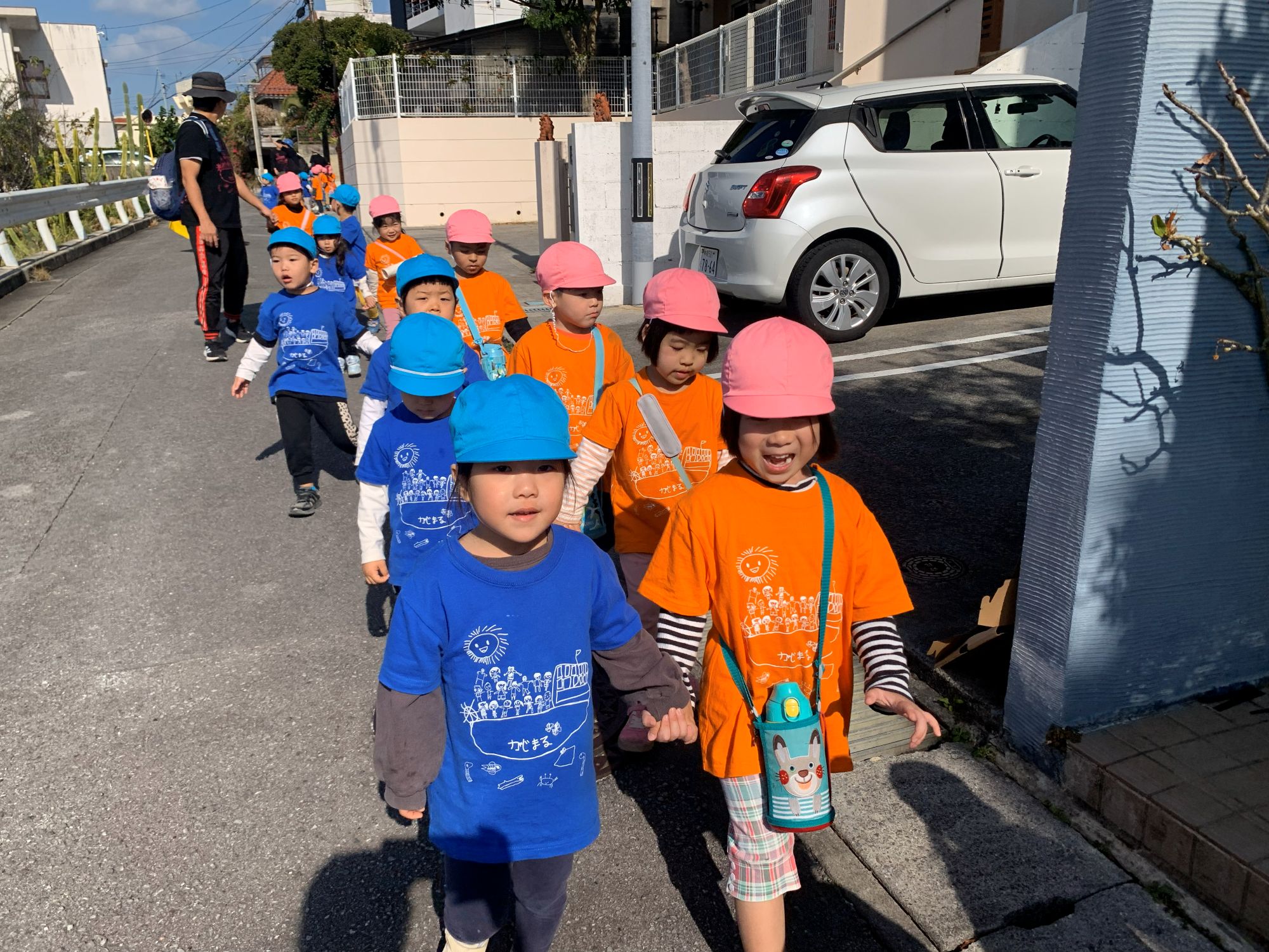 ひよこぐみ(0歳児)からぞうぐみ(5歳児)までそれぞれのクラスで決めた場所を目指して歩きます!