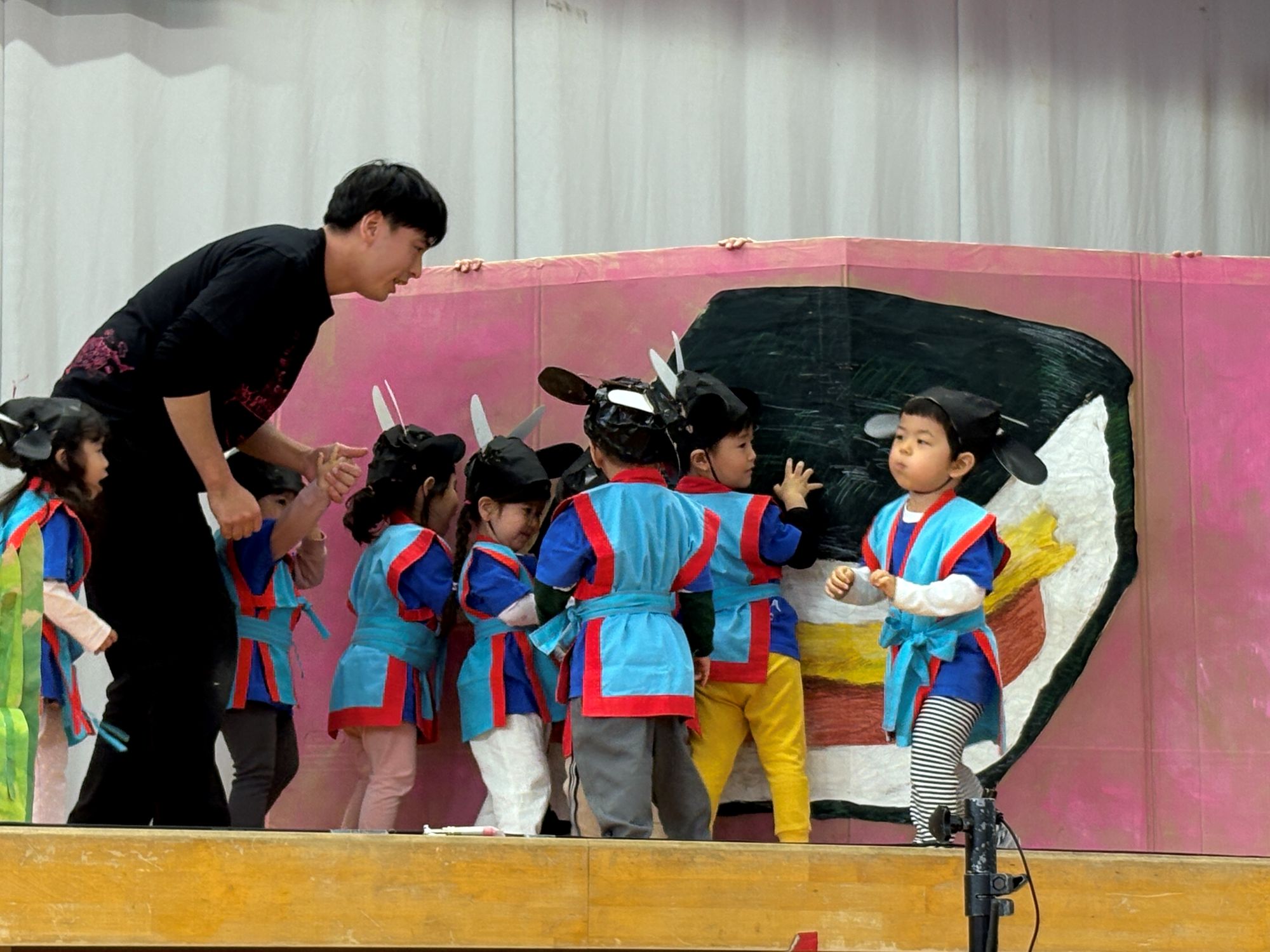 大好きな紙芝居と大好きなエイサーを組み合わせ、ヤギ・うし・うまの動物になりきって登場しましたよ~