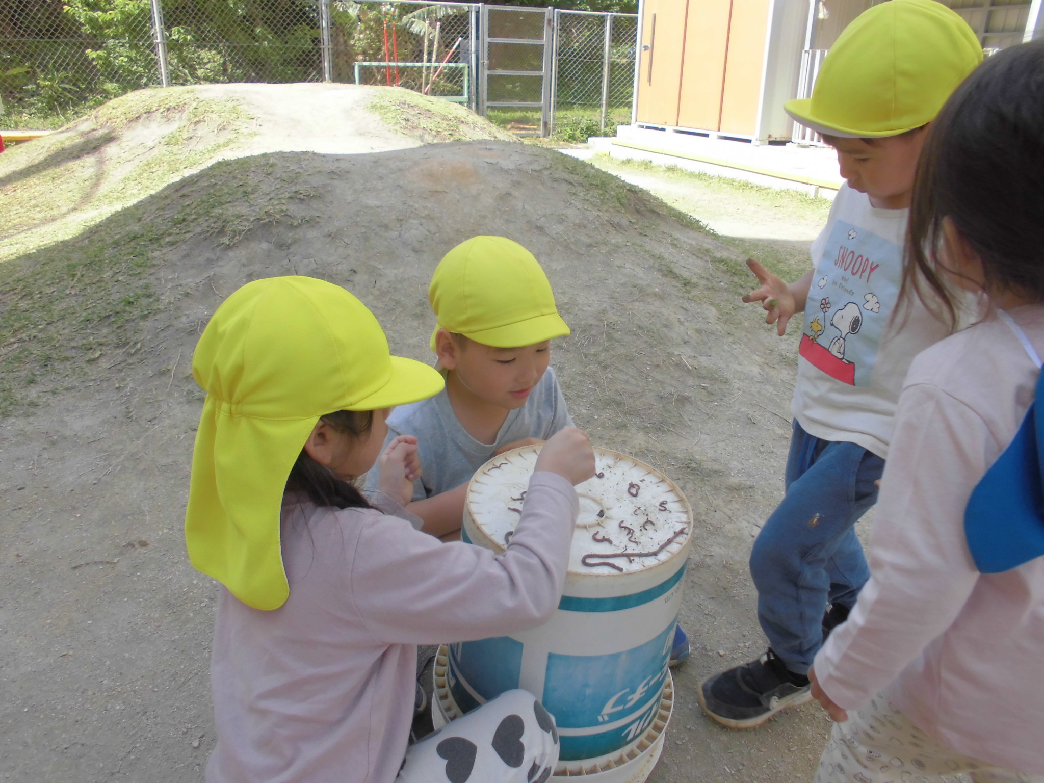 土をせっせと集めて、ミミズのお家を作ってあげていました。