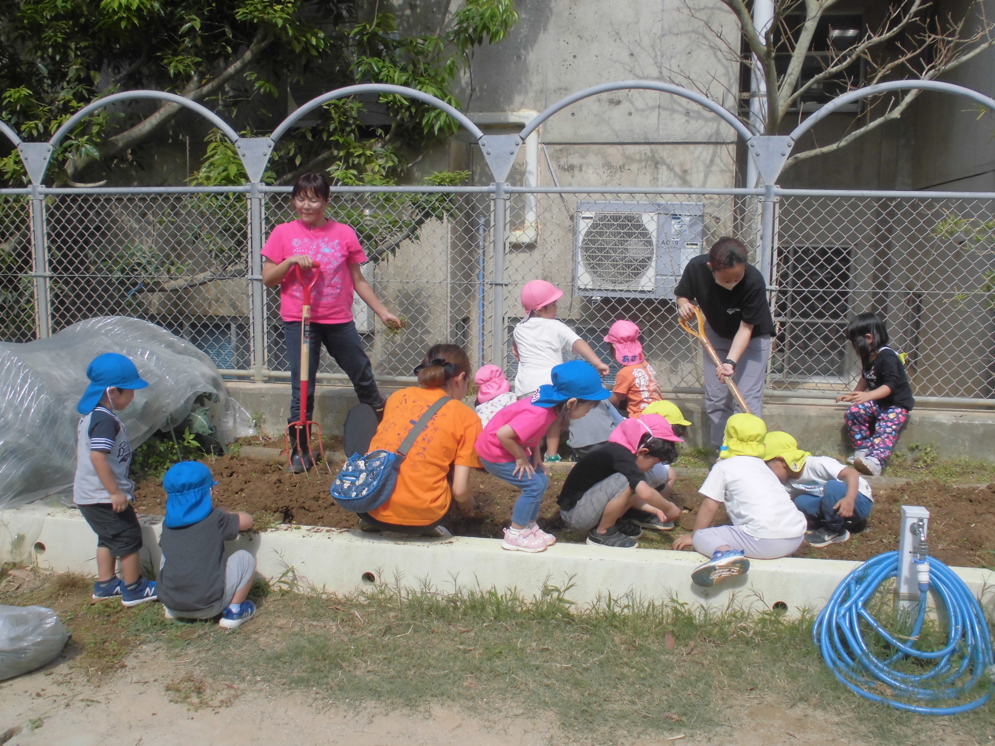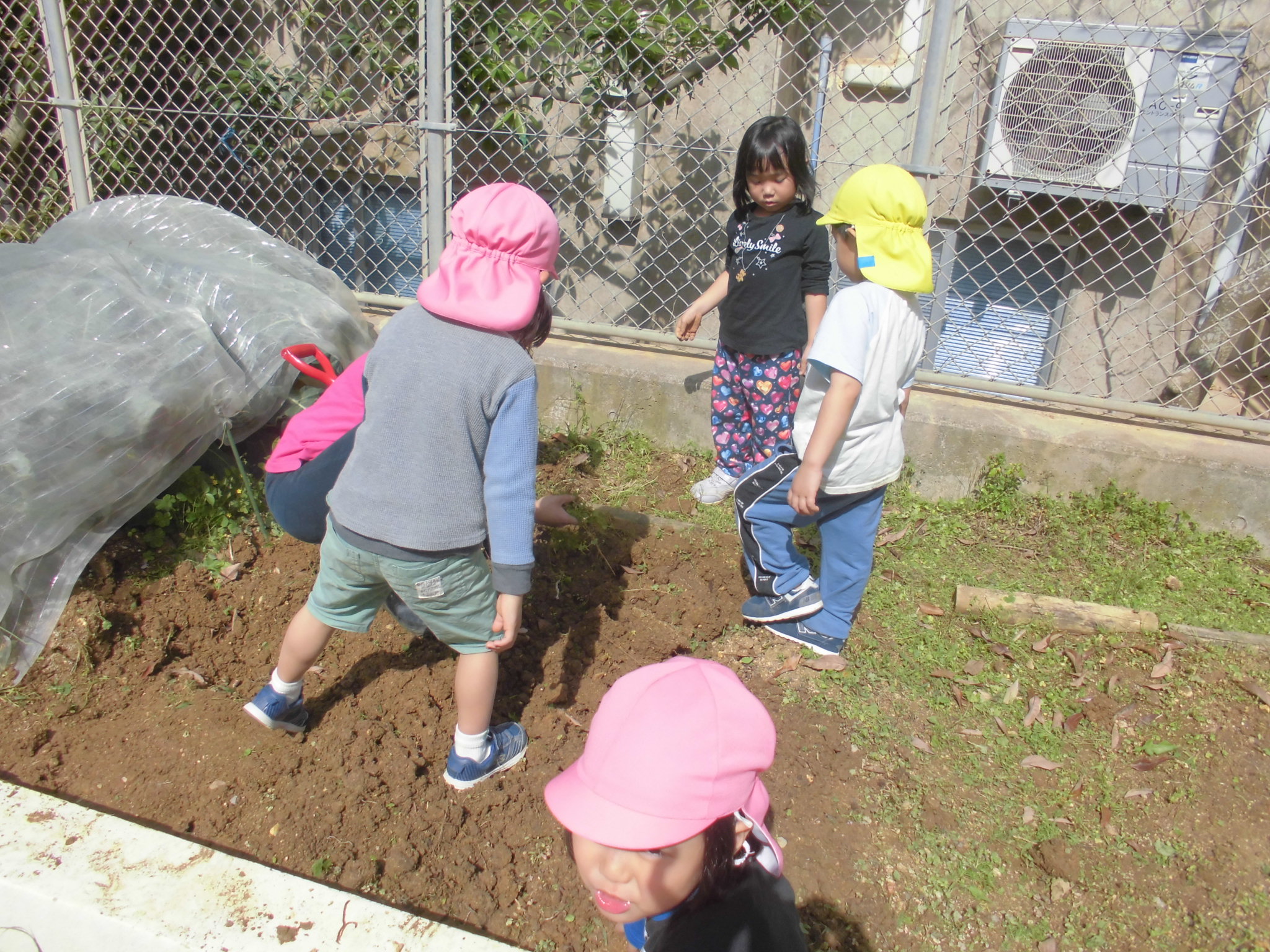 園芸活動 園庭にある広い畑を次の栽培に向けて、みんなで整備しました。
