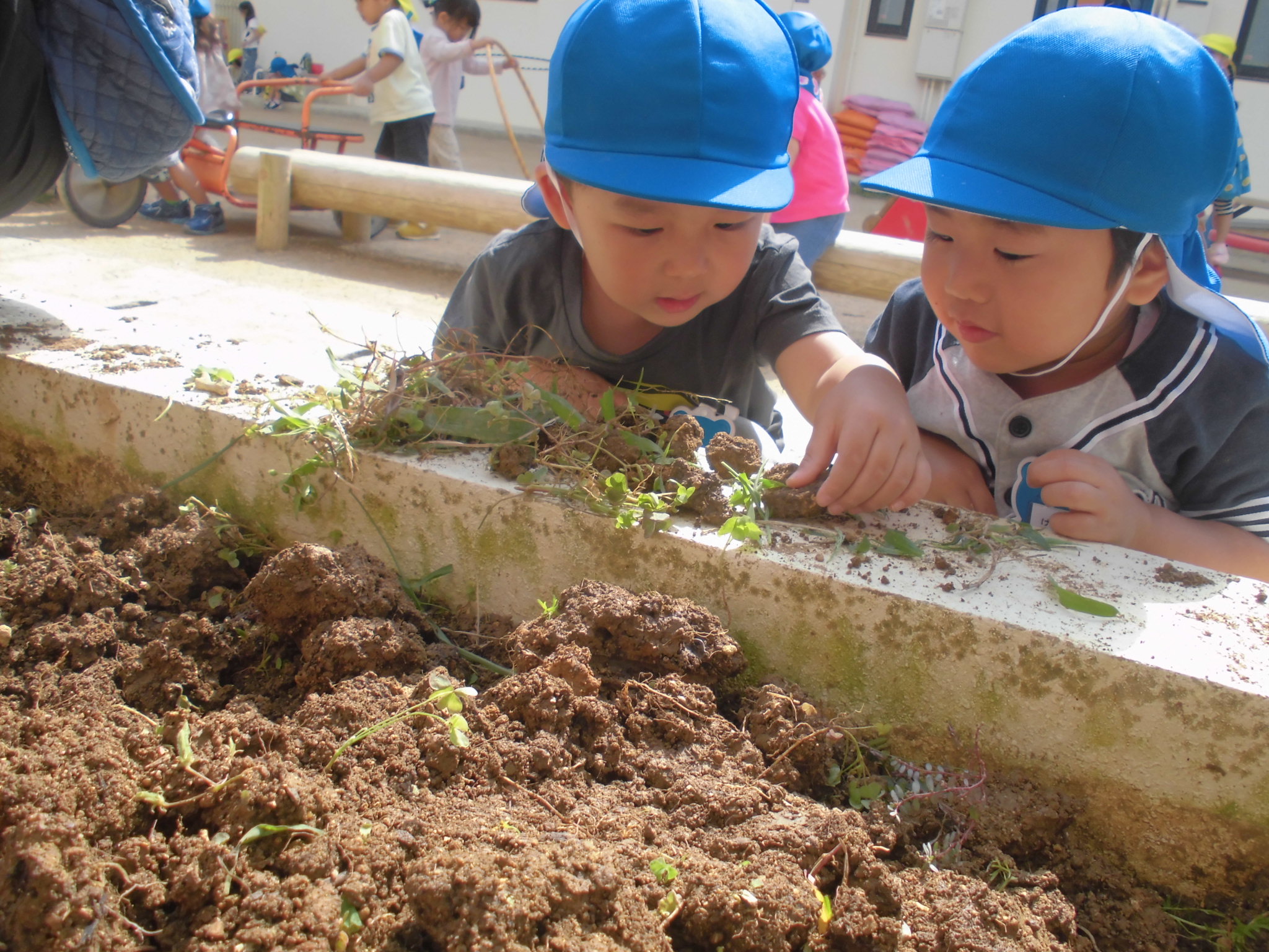 保育教諭と一緒に雑草と抜いていると、「あっ!!にょろにょろのミミズが出てきた」と