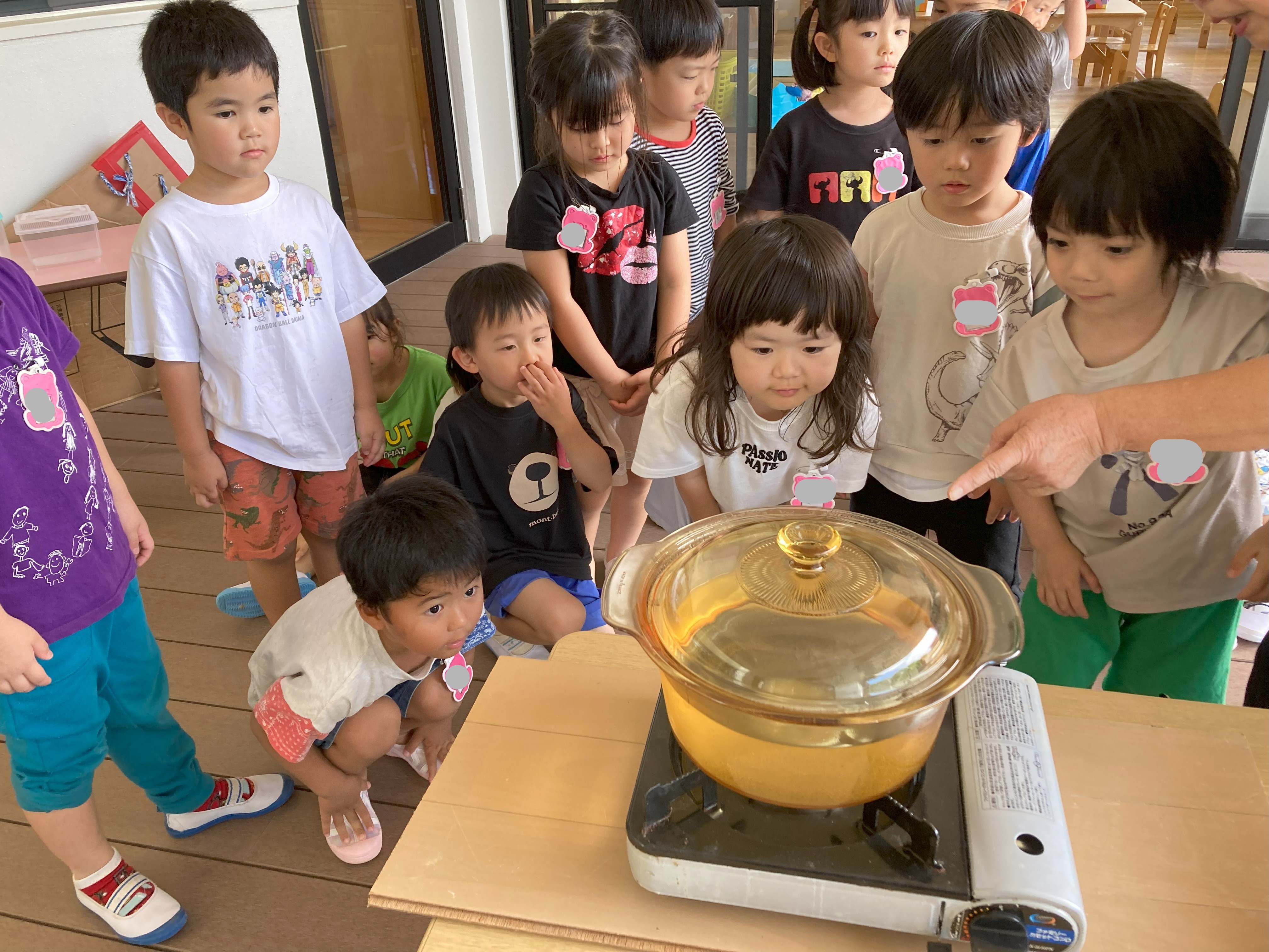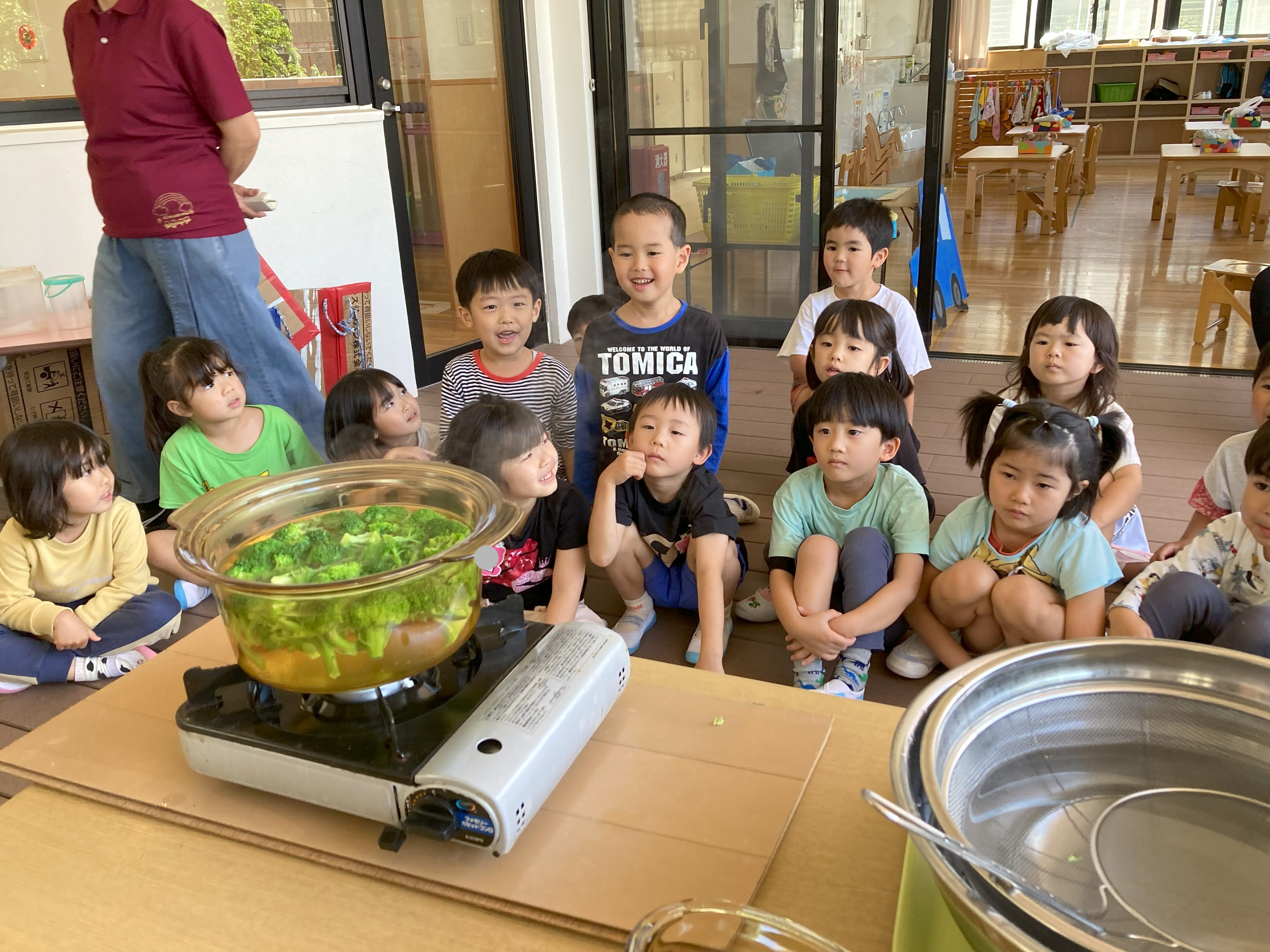 お水が沸騰する様子、ブロッコリーが茹で上がる様子を真剣に観察しました。