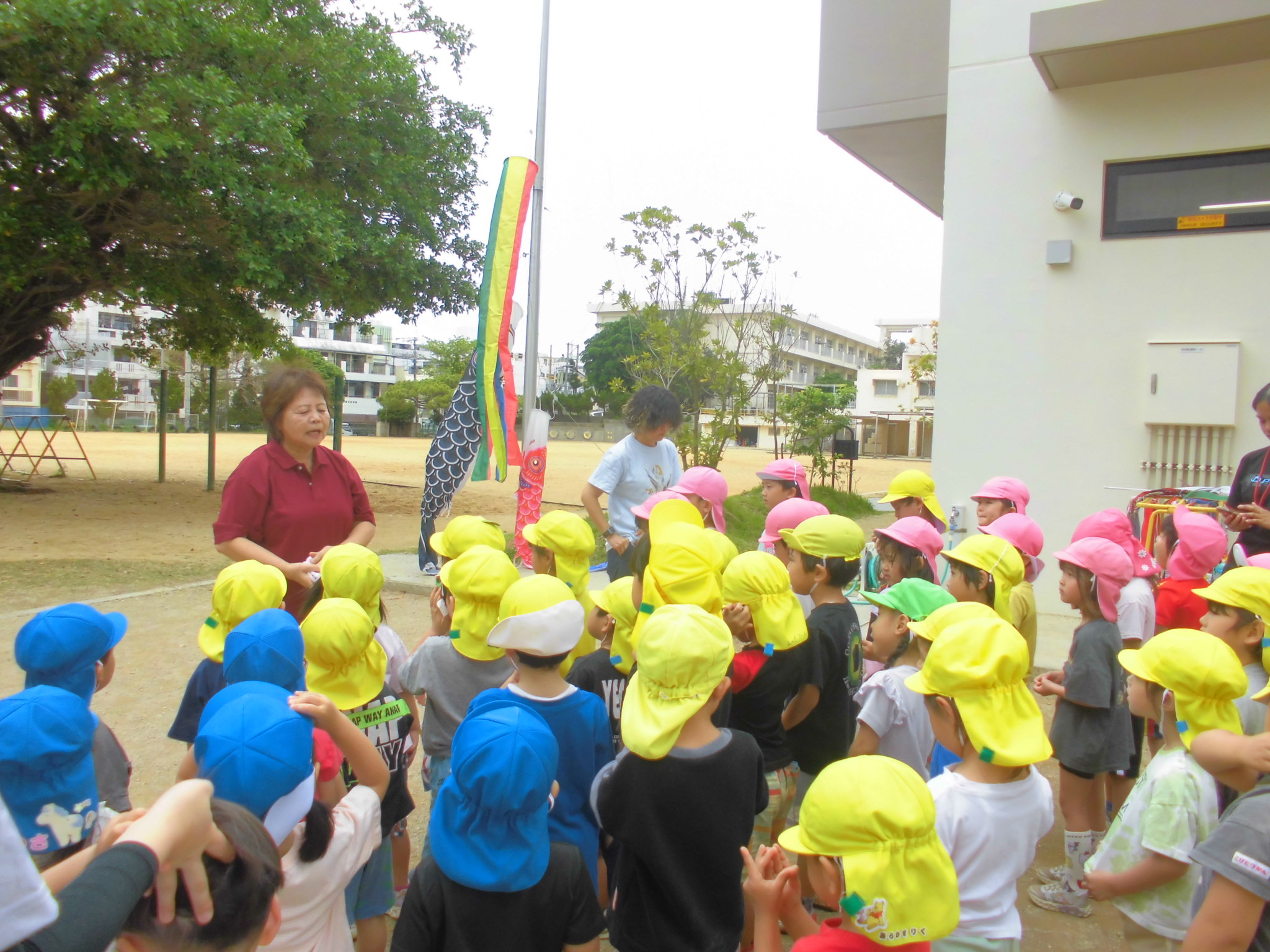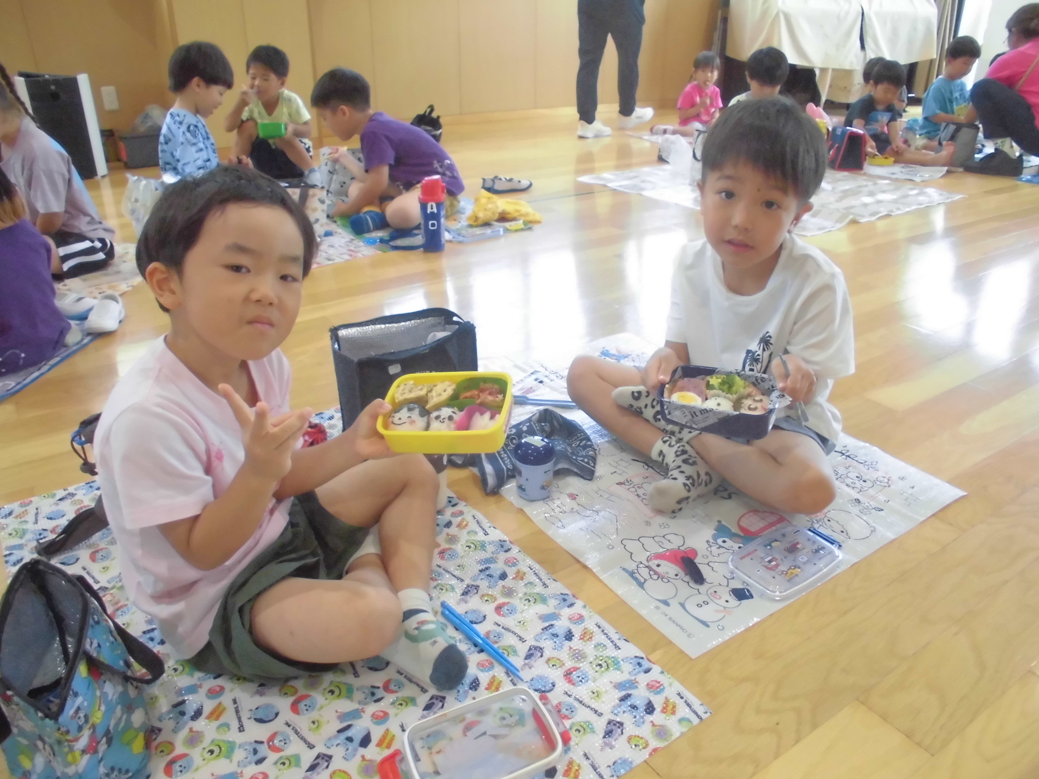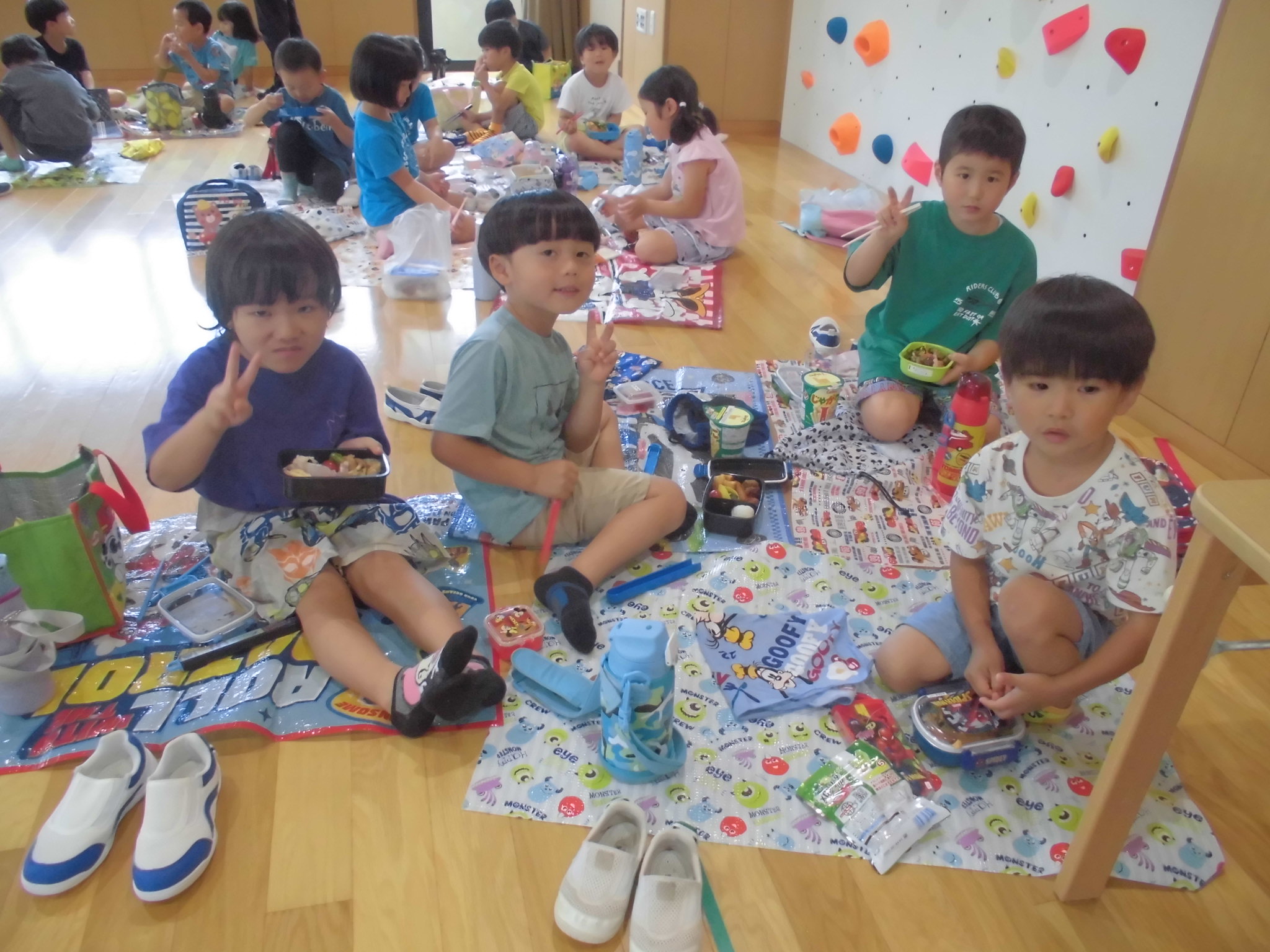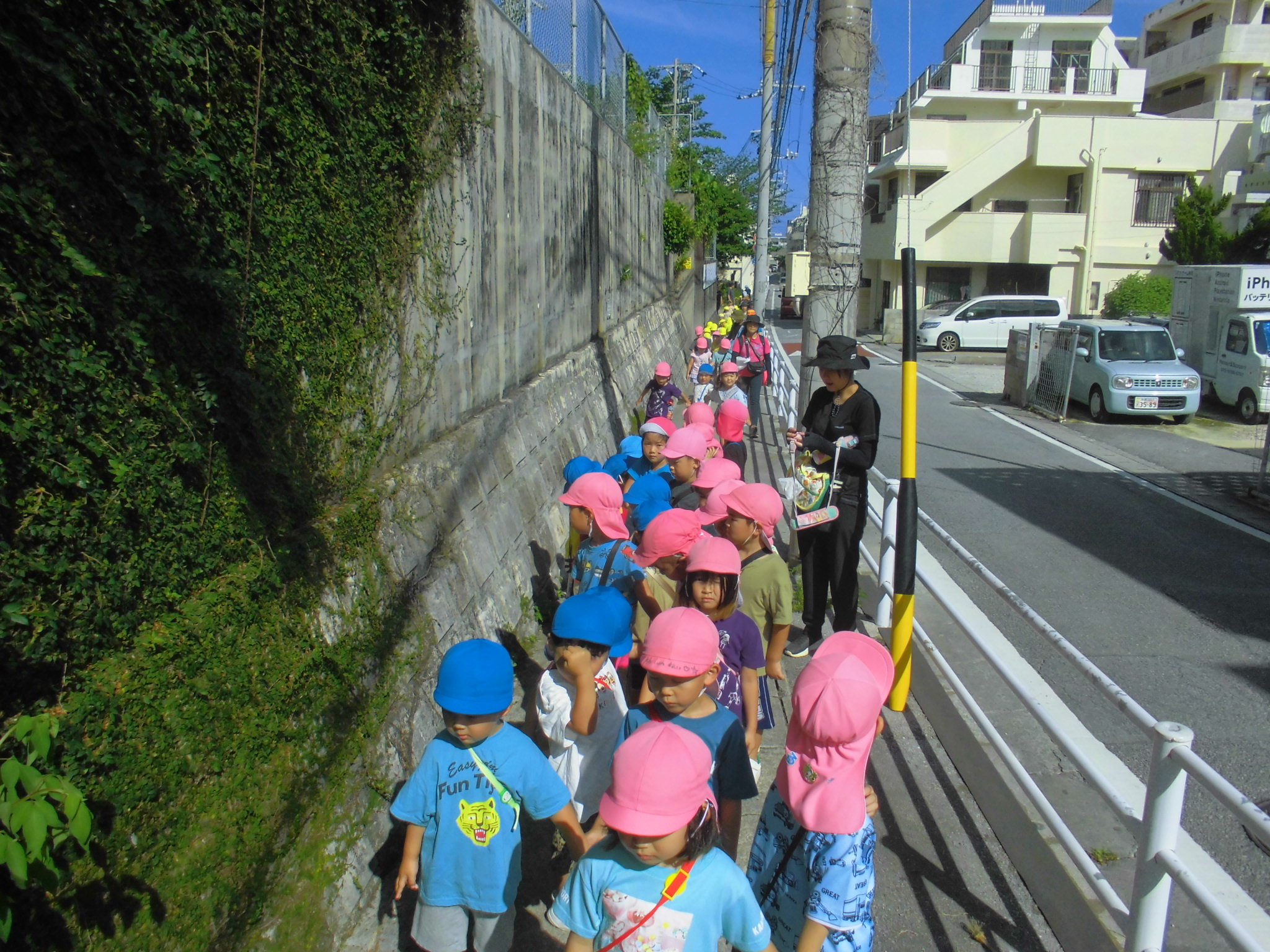 外気の気温が高く、熱中症対策として今回の遠足は、近所の散歩と園内(遊戯室)で