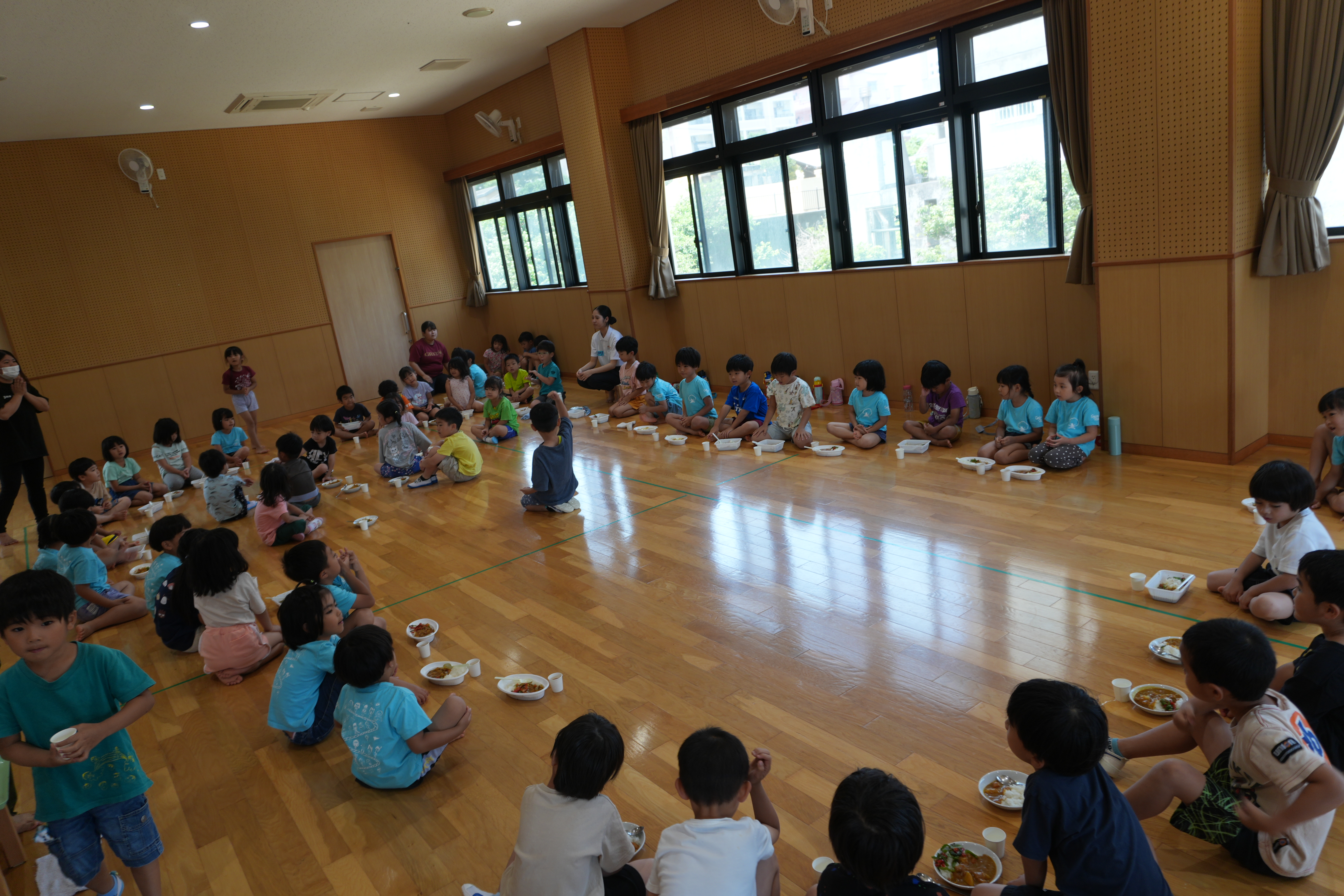 楽しいどろんこあそびの後は、安謝こども園のお遊戯室に集まって、各園からもってきた