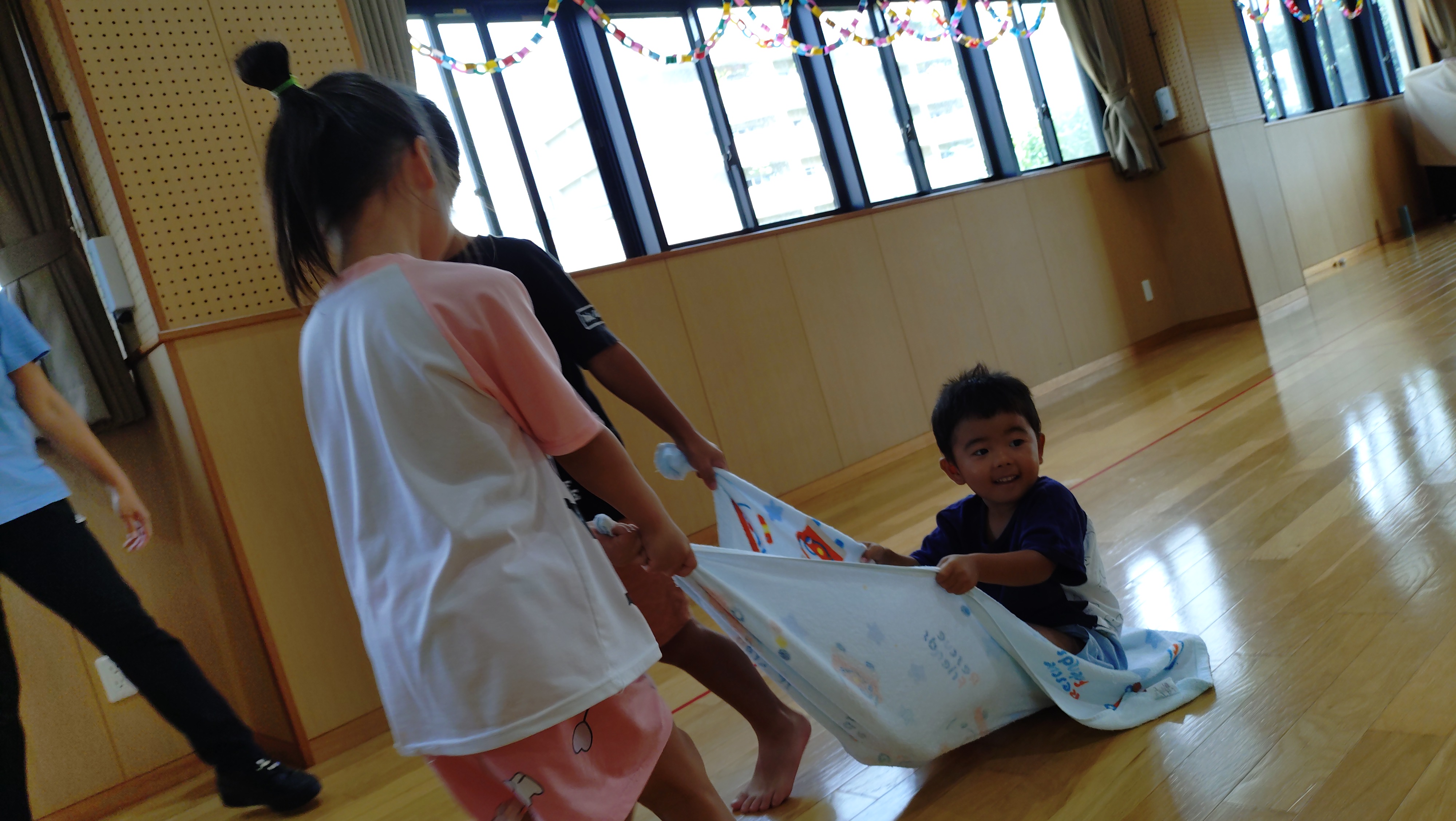 タオルケットに座っている3歳児を卒園児2人が引っ張ってもらい競争をしました。