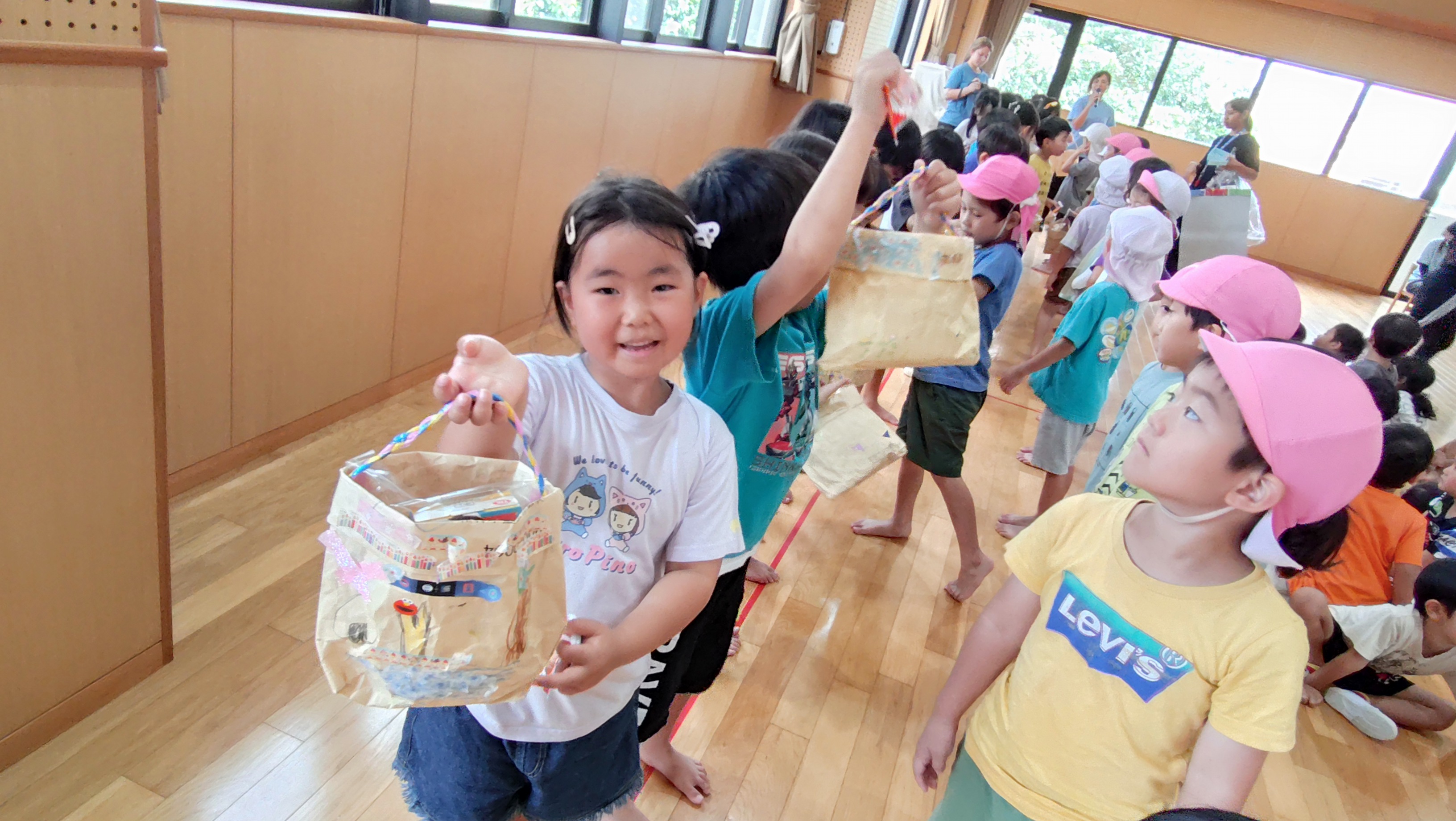 卒園児へのお土産は、年長組が作った紙バックとお菓子やおもちゃをもらいました。。