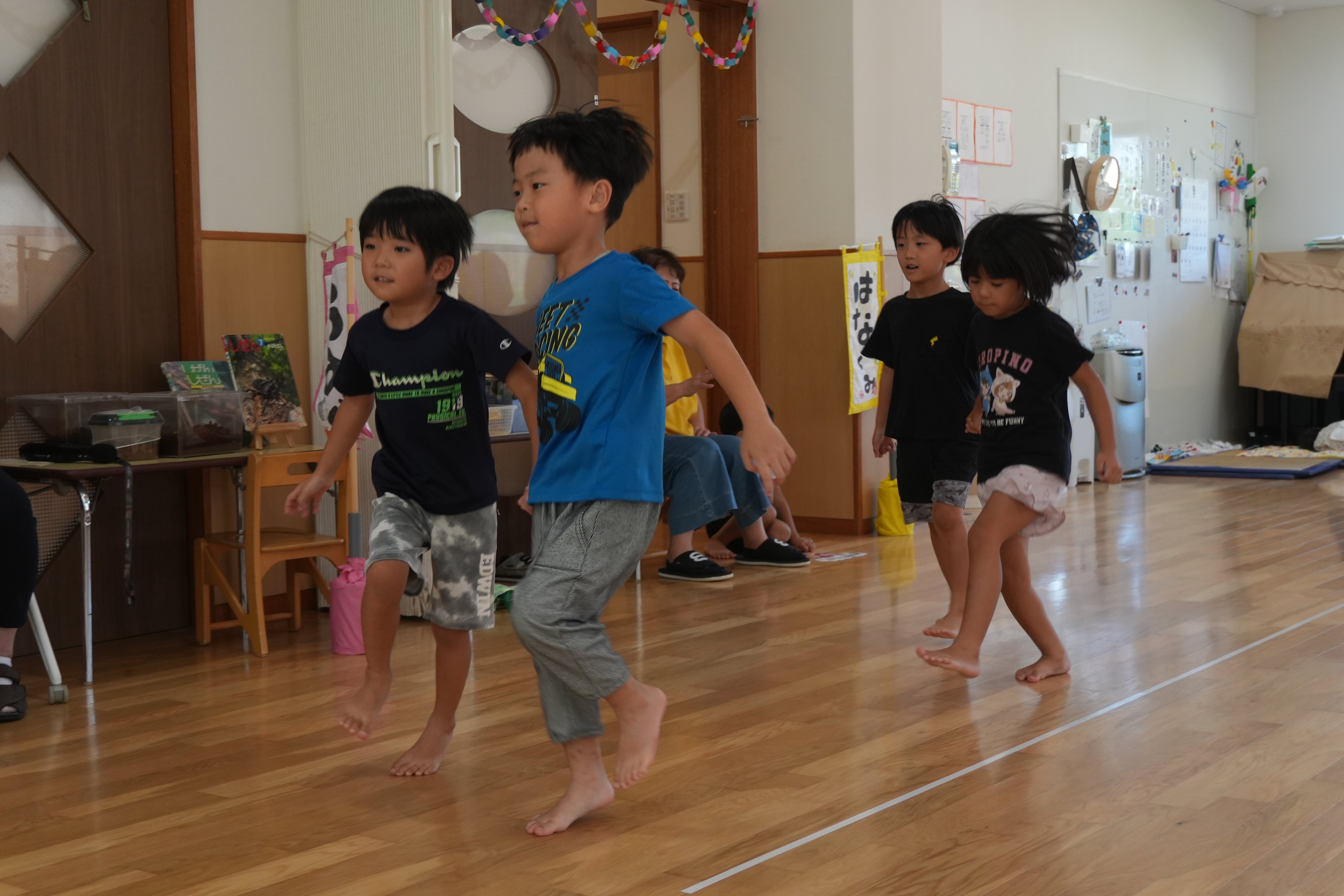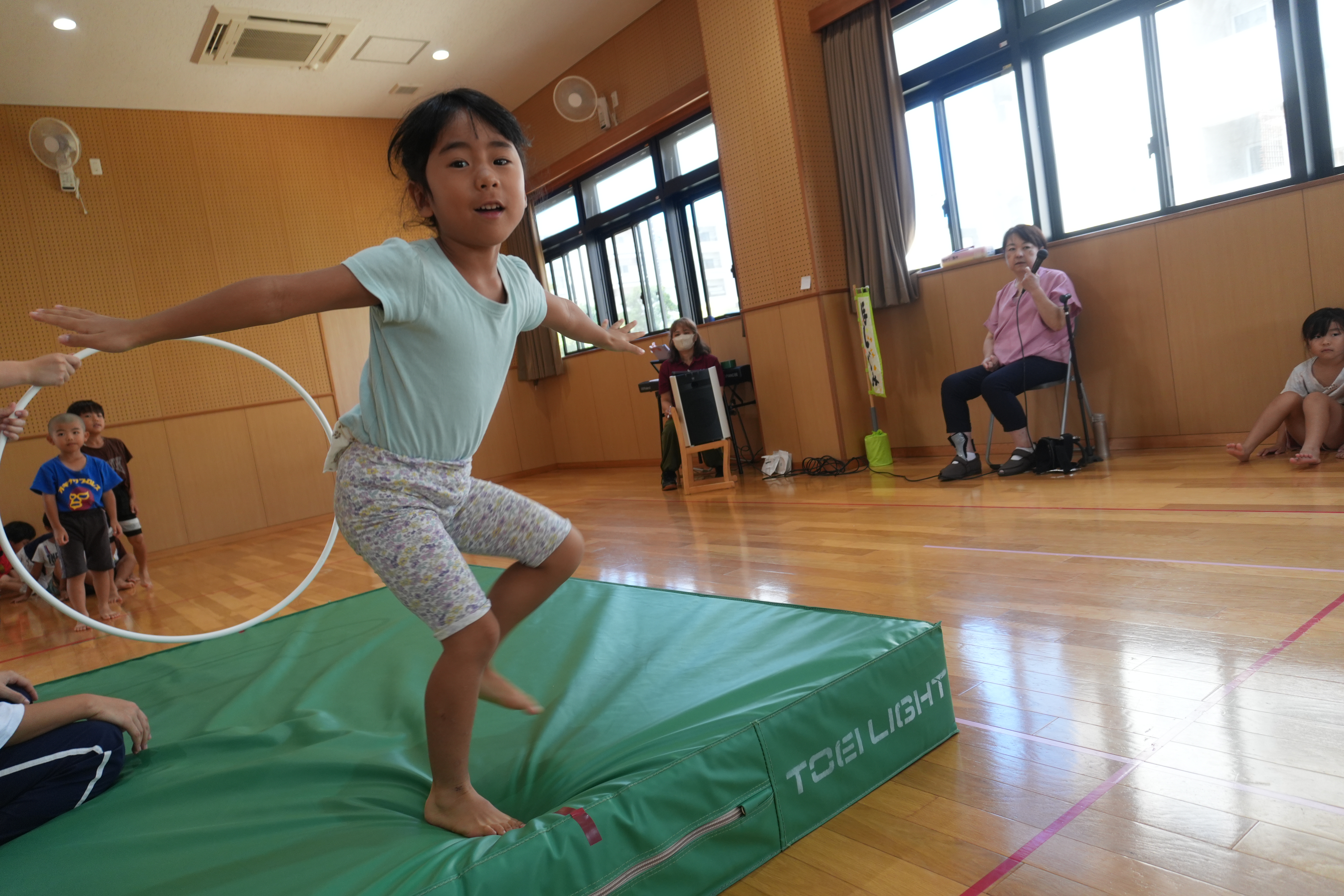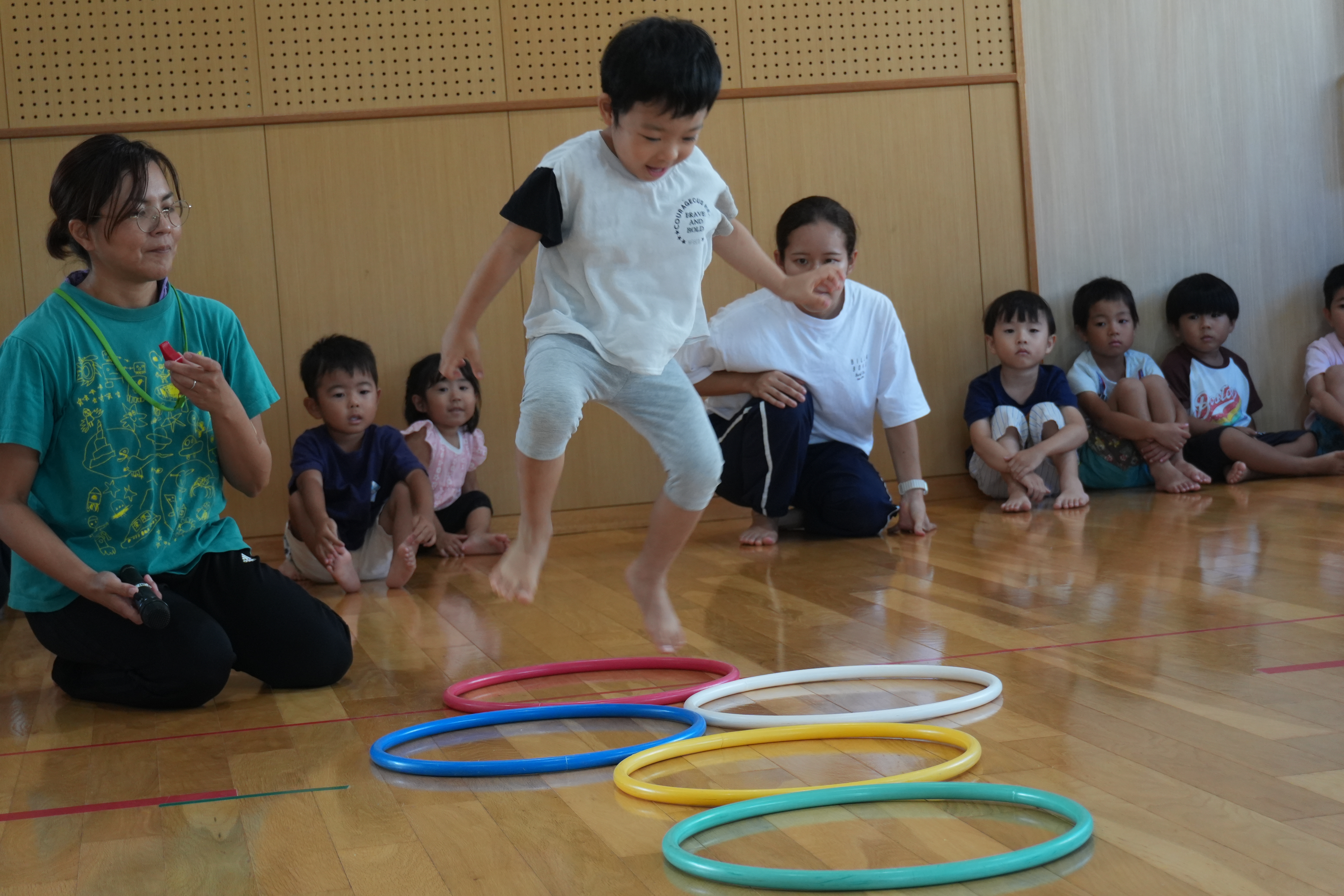 3歳児→かけっこ、運動サーキット(平均台、ケンケンパー、ジャンプ)